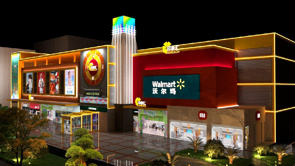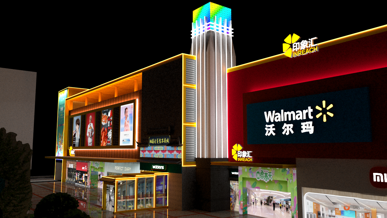 在具體方案中,設(shè)計(jì)團(tuán)隊(duì)采用 "分層布光、主次呼應(yīng)" 的策略:建筑主立面以 3000K 暖白光洗墻燈為基礎(chǔ),通過精準(zhǔn)的光束角控制,勾勒出簡(jiǎn)潔大氣的建筑輪廓,既凸顯了現(xiàn)代商業(yè)建筑的利落線條,又與沃爾瑪超市的溫馨消費(fèi)氛圍相適配;裙樓部分則創(chuàng)新采用暗藏式 LED 線條燈,沿商鋪招牌的邊緣有序排布,在夜間形成連貫的光影燈帶,既保證了商鋪標(biāo)識(shí)的清晰呈現(xiàn),又避免了強(qiáng)光對(duì)行人的視覺干擾。這種設(shè)計(jì)既尊重了建筑原有結(jié)構(gòu),又通過燈光層次的變化,讓建筑在夜色中呈現(xiàn)出 "遠(yuǎn)觀有輪廓,近賞有細(xì)節(jié)" 的視覺效果。