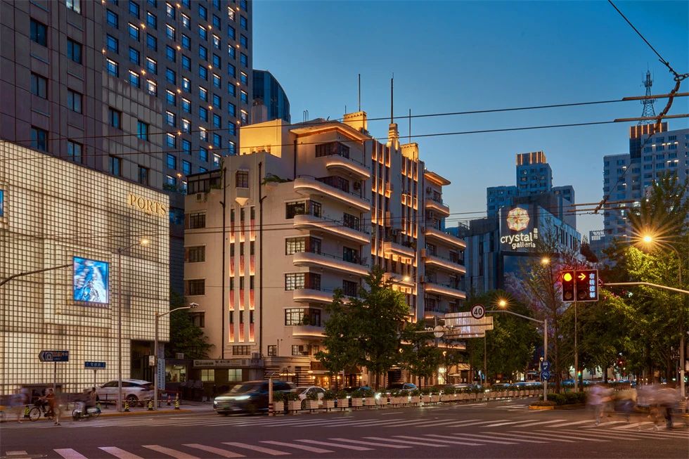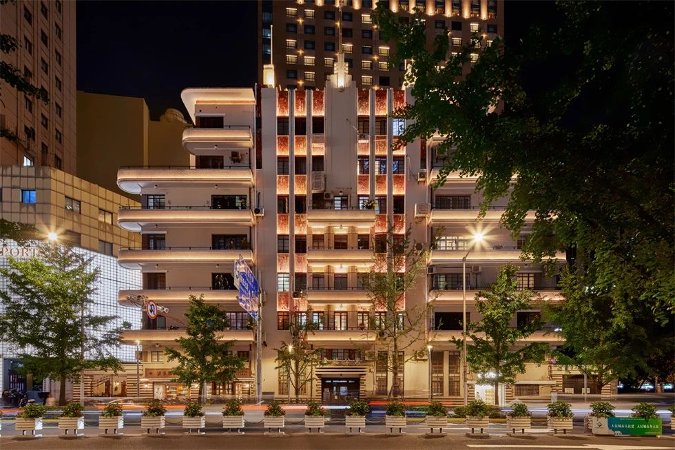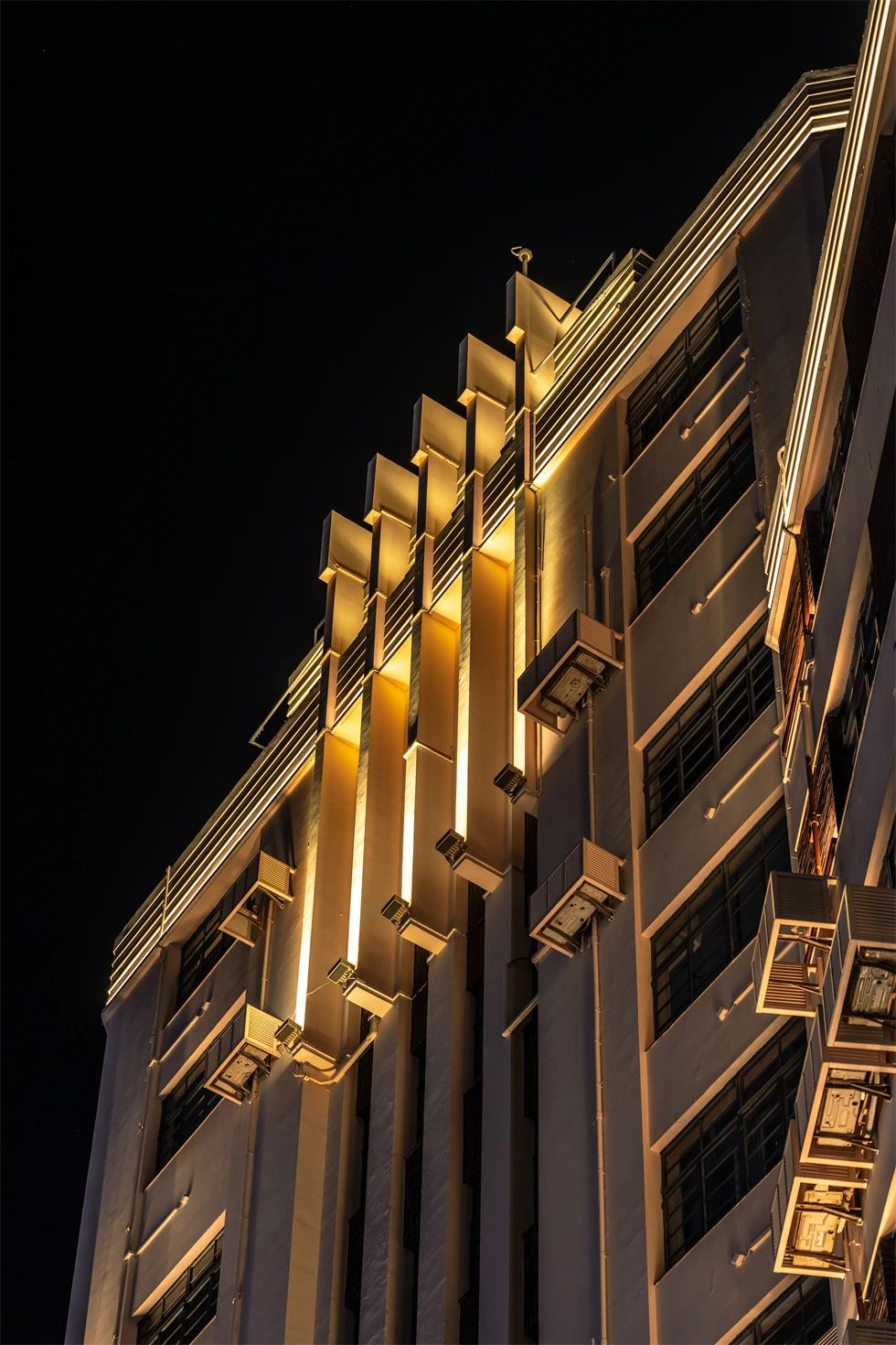 常德公寓為1936年竣工的裝飾藝術(shù)派風格建筑,夜景重點表現(xiàn)其東立面,層層向上的燈光富有節(jié)奏地烘托中部豎向線條,柔和升起的水平線性燈光優(yōu)雅細膩地展現(xiàn)弧形伸展的陽臺,配合搖曳發(fā)光的裝飾燈,典雅低調(diào),令人駐足。